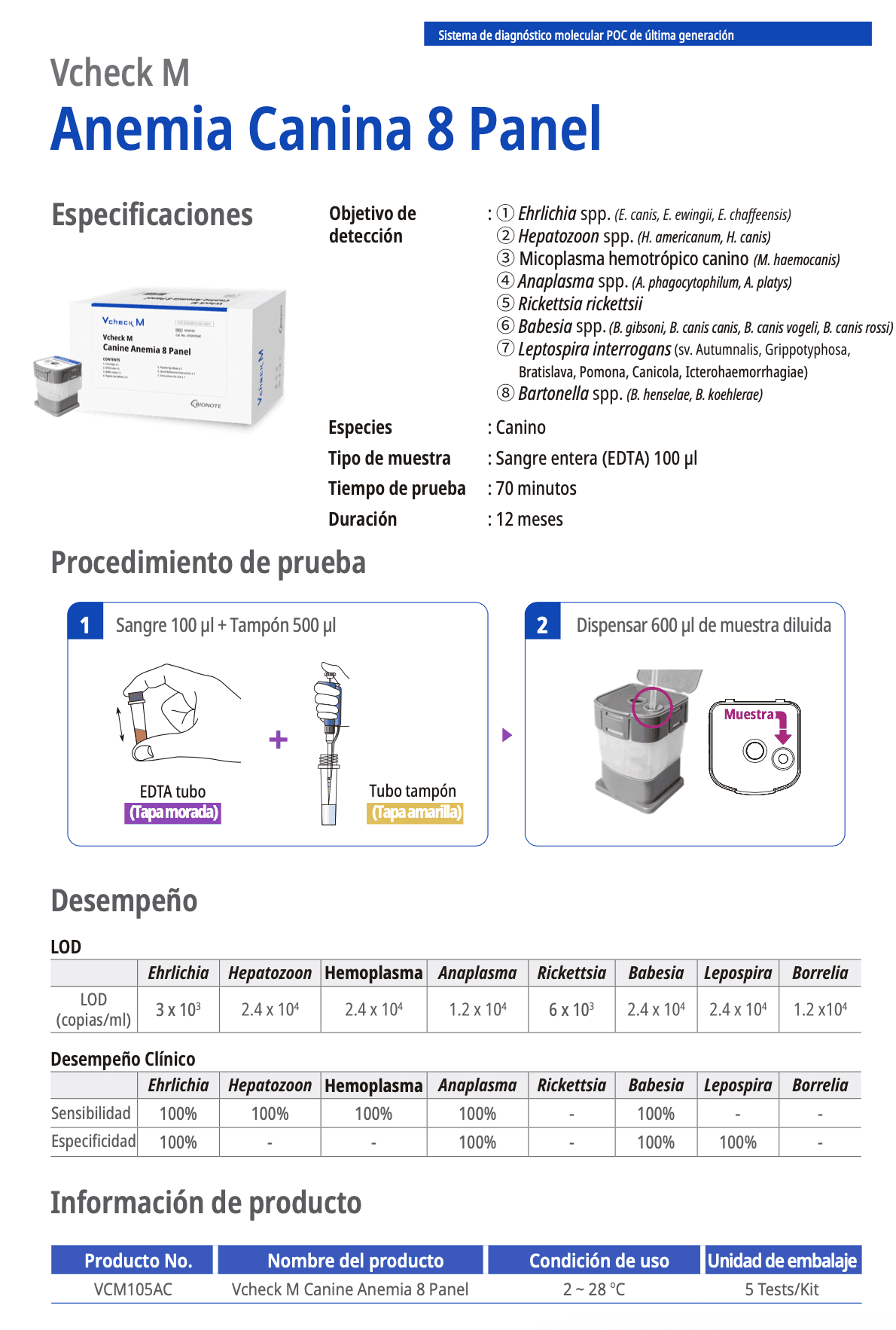 Cartucho de diagnóstico molecular POC para la detección de ADN de 8 patógenos que causan anemia canina en sangre entera canina