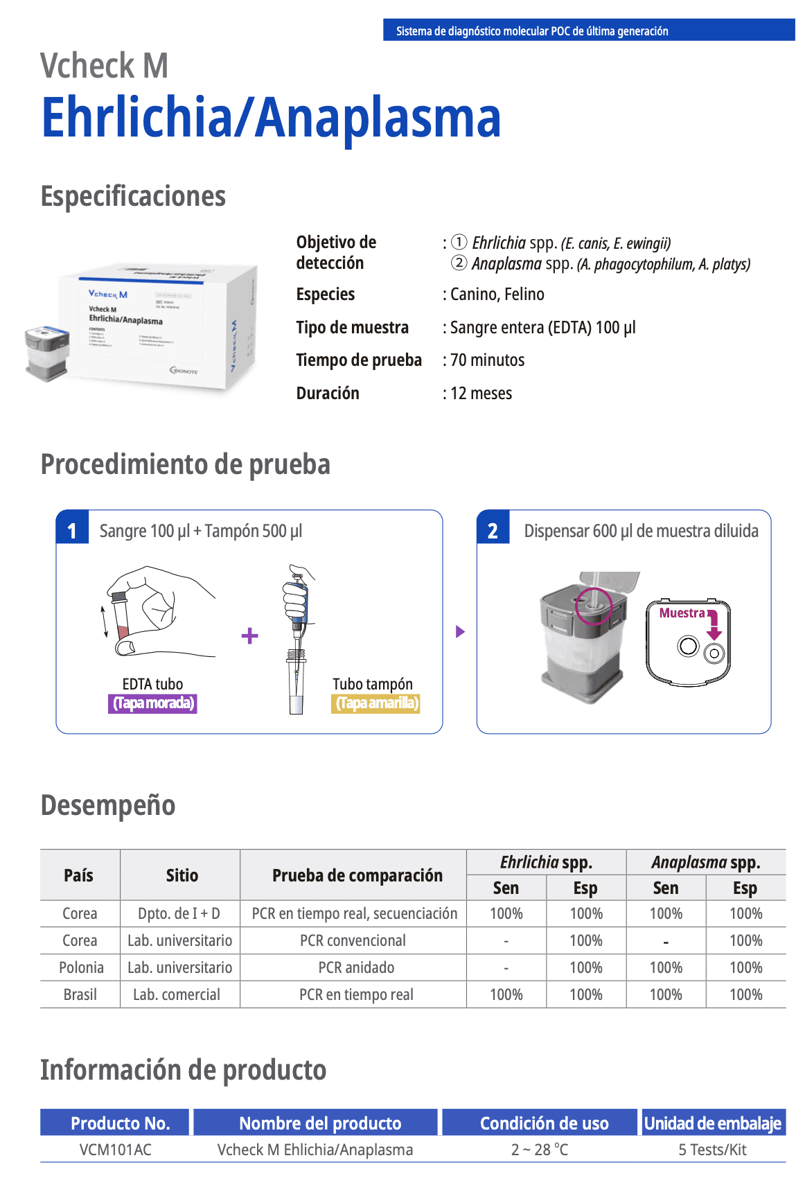 Cartucho de diagnóstico molecular POC para la detección cualitativa de ácidos nucleicos de las bacterias Ehrlichia y Anaplasma en sangre total (EDTA) recogida de perros y gatos.